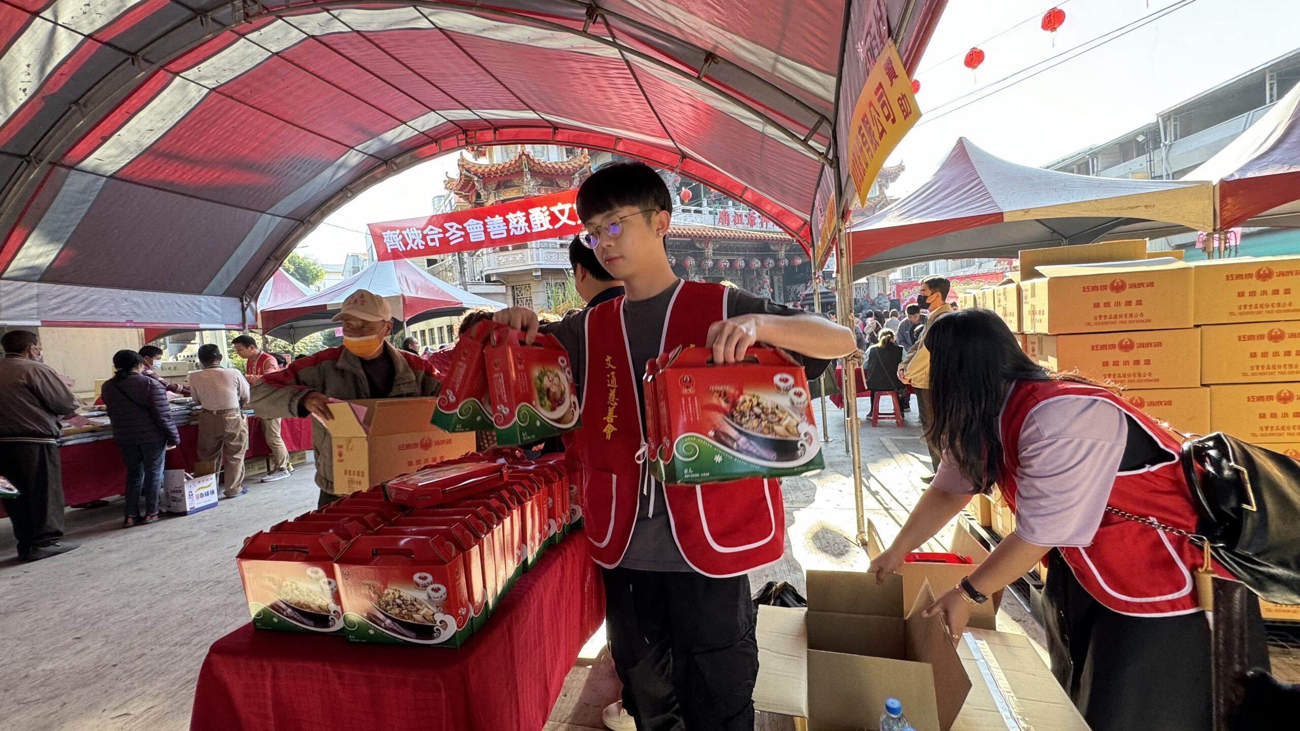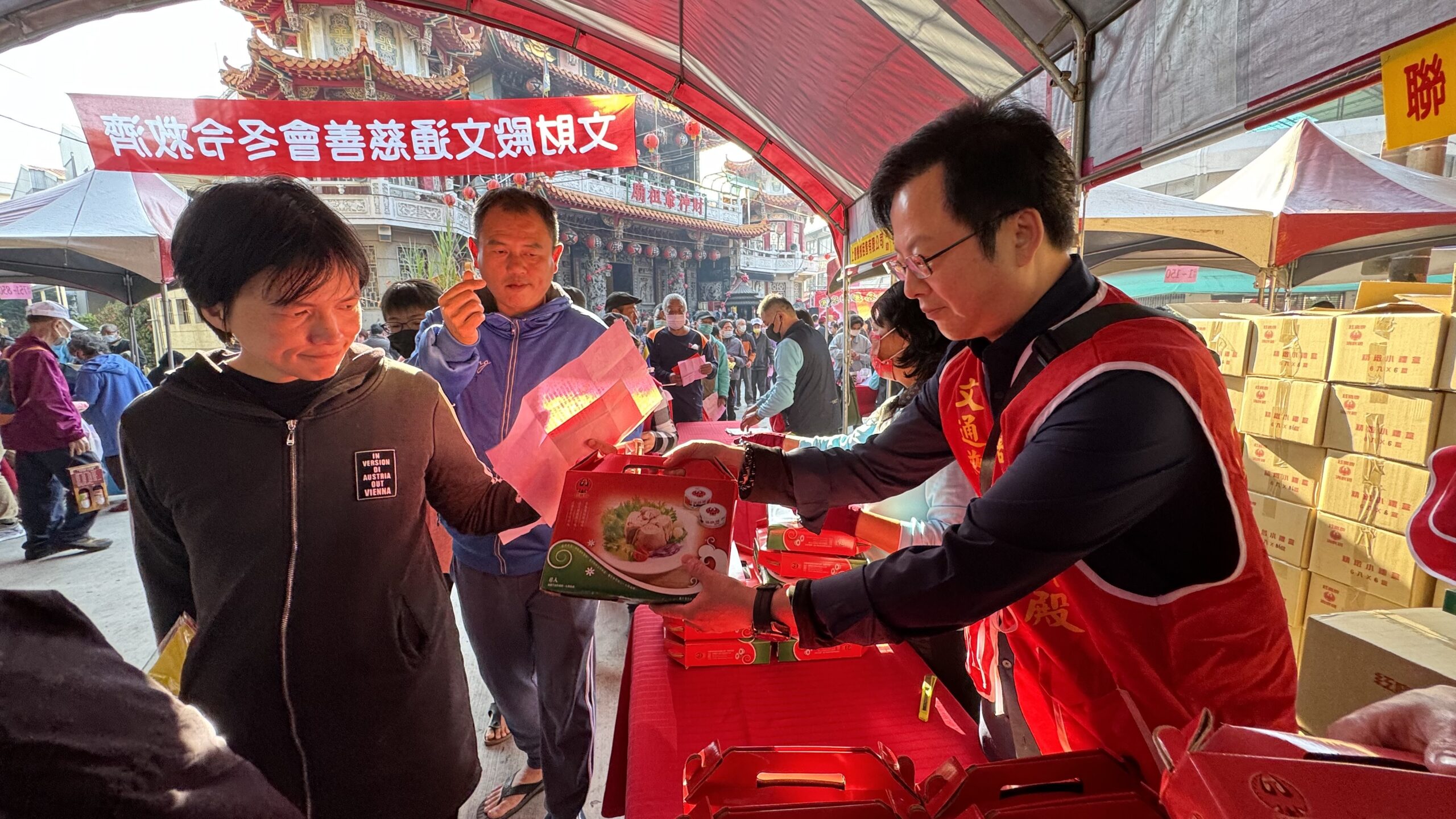 嘉義文財殿附屬文通慈善會日前(31)在文財殿廣場,舉辦112年度「冬令救濟暨義剪活動」,提供850戶弱勢家庭2千元紅包禮金、白米及民生用品各一份,現場還有嘉義市女子美容商業同業公會提供義剪服務,嘉義市長黃敏惠到場協助發送紅包禮金,寒冬送暖大家有錢出錢有力出力。