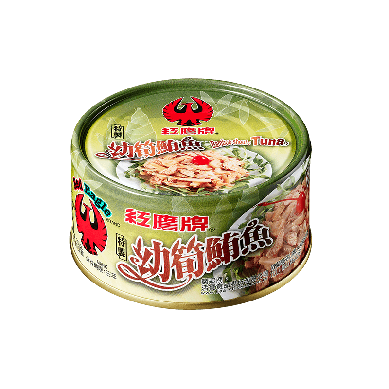 正鰹(鮪族)、嫩筍、水、大豆沙拉油、麻油、糖、鹽、油性辣椒紅(葵花油、辣椒)、水性辣椒抽出物(辣椒、單及雙脂肪酸甘油二乙醯酒石酸脂、卵磷脂)、調味劑(L-麩酸鈉、胺基乙酸、DL-胺基丙酸、琥珀酸二鈉、檸檬酸鈉、5'-次黃嘌呤核苷磷酸二鈉、5'-鳥嘌呤核苷磷酸二鈉、甜味劑(甘草萃)、乳糖